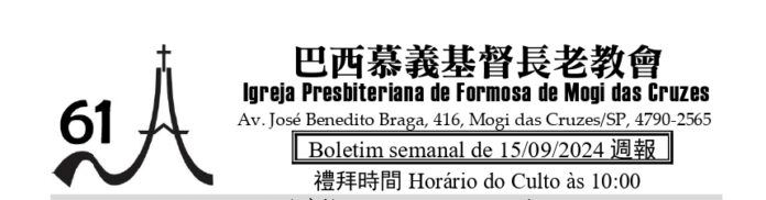 慕義基督長老教會 (Mogi / SP)教會消息 慕義教會電子週報/15-09-2024 mogi.ipfmc - 17/09/2024 0 40 LINEFacebookTwitterWhatsApp