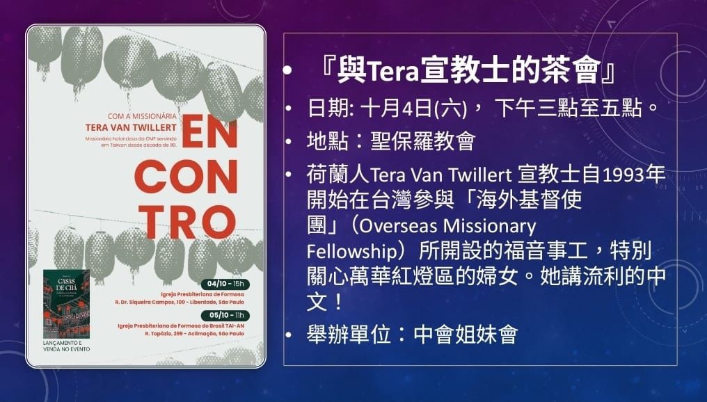 首页 教会消息 與Tera宣教士的茶會&#... 教会消息 與Tera宣教士的茶會–中會姐妹會主辦 Sulamev - 03/10/2025 57 0 LINEFacebookTwitterWhatsApp 中會姐妹會訂於十月4日(周六)下午3~5點,在聖保羅教會舉行[與Tera宣教士的茶會],歡迎踴躍大家參加,同得造就。 留下您的评论 取消评论 请填写您的评论! 请填写你的姓名 您填写的邮箱错误! 请填写你的邮箱 将我的姓名、电子邮件和网站保存在此浏览器中,以便下次我发表评论。 中秋─充滿神恩典祝福的日... Sulamev - 17/09/2024 0 農曆八月十五日中秋節,又稱為八月半;是一個月圓人... 聖經中的父親 ... 21/08/2023 為什麼耶穌要高調「騎驢」... 25/03/2024 告別春節連假迎接新的開始... 03/02/2025 基督徒要感恩的三个原因 01/02/2015 十首最佳感恩诗歌精选合集... 20/09/2022