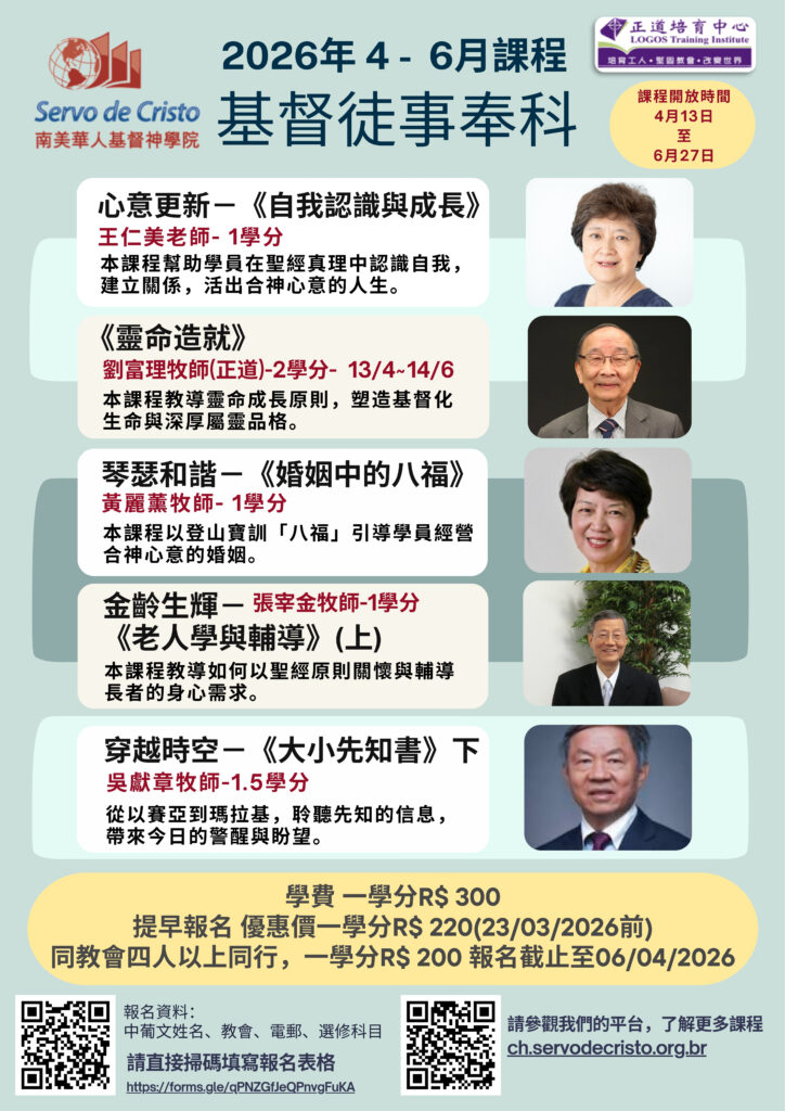 2026年4-6月基督徒事奉科的課程已經出爐了,課程精彩。敬請鼓勵教會弟兄姊妹踴躍報名,同得造就。謝謝!